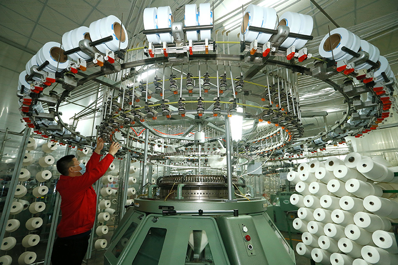 11月29日,山東青島頤和針織有限公司的紡織工人在生產(chǎn)出口到海外市場的服裝面料。