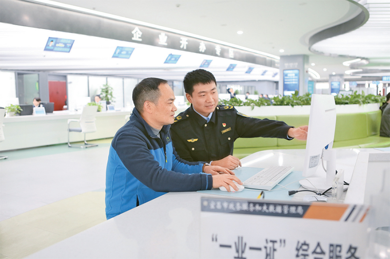 優化營商環境,是培育和激發經營主體活力、增強發展內生動力的關鍵之舉。圖為2023年11月27日,在湖北省宜昌市市民之家市場監管局窗口,工作人員指導企業人員在線辦理企業登記注冊業務。 湖北省宜昌市市場監管局供圖